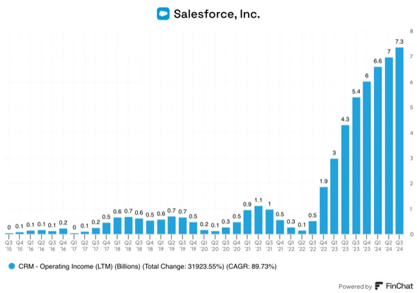 Salesforce is proof that patience pays off in software. For two decades, they poured money into growth, and critics wondered if they'd ever focus on profits. Turns out, they were building a profit machine all along – they just needed a little push to turn it on.